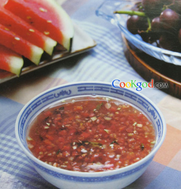 1.番茄洗净,用开水烫后去皮,捣碎。