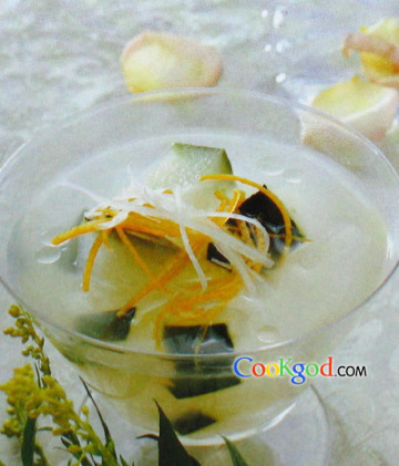 2、锅内加清水,放入冬瓜块、陈皮丝,加盐调味,用旺火烧开,改小火煮至冬瓜熟烂,加味精,葱丝,淋少许色拉油即成。