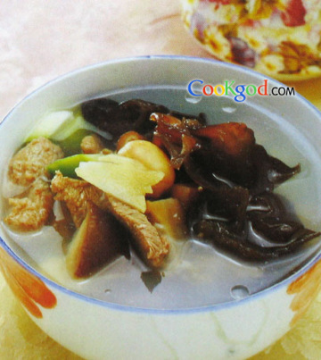 用料冬菇(浸软)10个,葫芦250克,水发木耳20克,莲子75克,猪瘦肉150克,姜2片,盐适量。