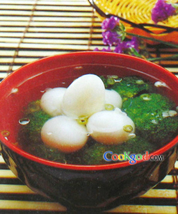 3、另起锅放清水,下西兰花,旺火烧开后煮约3分钟,倒入鸽蛋稍煮,加精盐调味,撒上葱花、姜末,淋少许香油即成。