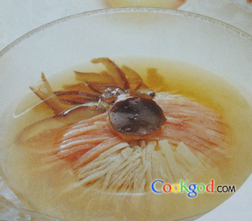 1、香菇去蒂,洗好备用。猪腿肉、火腿肉、鸡脯肉、冬笋统一切成长细丝,间隔放入碗中,浇入少量高汤,撒味精、盐,上屉蒸约半小时,取出翻扣在汤盆中。