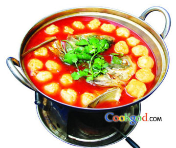 3、取锅仔一个,锅底垫黄豆芽,倒入用糊辣椒面、酥黄豆、腐乳、盐、味精、香菜加少许酸汤调制成的沾水,放入鱼头和鱼丸,撒上香菜,吃时点上酒精炉即可食用。