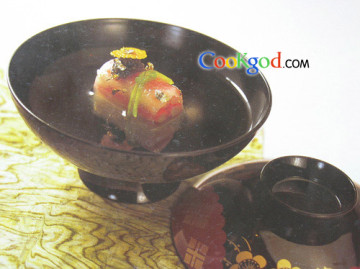 (5)碗内轻轻注入清汤,在顶部放上乌鱼子及柚子皮。