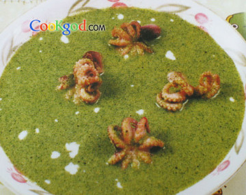 2、再加入牛奶、奶汁、小茴香、鱼高汤一起用小火煮,待汤汁浓度适合时加入盐、胡椒粉调味即可,最后加入小章鱼。