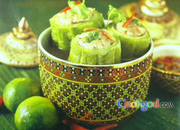 (2)将芫荽头和蒜肉剁碎,加入冬菇粒、猪肉糜和腌料拌匀,酿入凉瓜内。