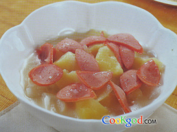 材料土豆500克,肉汤800克,火腿片150克,洋葱50克调味料芥末30克,盐,胡椒粉各适量