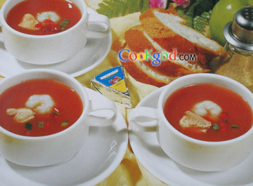 材料鸡肉、虾仁、洋葱末、蒜泥、青椒、红椒、柠檬汁、番茄、罗勒叶、鸡汤、番茄酱、黄油、面粉、盐、胡椒、葱花
