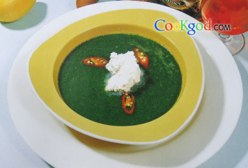 材料菠菜、薄荷叶、红尖椒、青葱、蒜茸、鸡汤、柠檬汁、百里香、酸奶、黄油、盐、胡椒