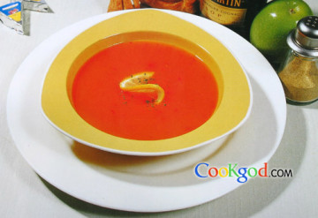 (2)用黄油将洋葱末、蒜茸煸香,加入红椒、番茄,翻炒煸透,直至红椒柔软,再加入鸡汤,烧滚约5分钟后离火。