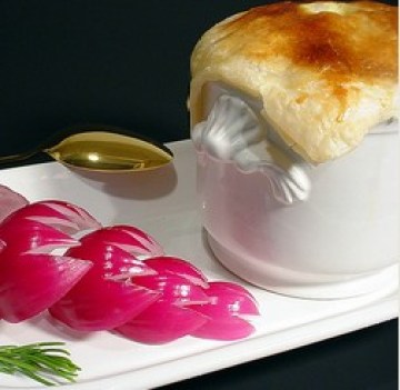 提示:做这道汤时,想避免酥皮塌陷,关键是在入烤箱前,汤一定要够热,另外, 酥皮一定要完全盖住碗口。