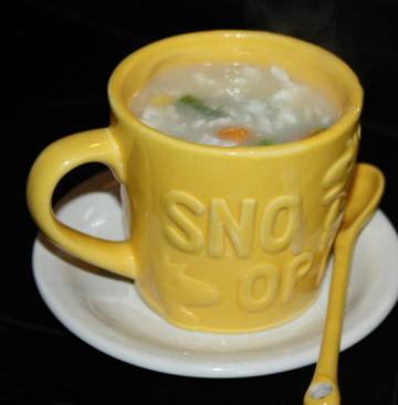 的面糊糊,再煮5分钟,放入玉米青豆粒,5分钟后浇入蛋清就好。不要放盐太多,这样材料的味道会更自然。