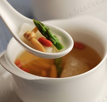 4) 将素高汤煮开,放竹荪,金针和姜片,中火煮5分钟。放芦笋,中火煮3分钟,加盐和香菇粉调味,淋几滴香油,放枸杞点缀。
