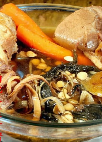 2、煲中热水煮滾后,放入猪骨、猪肉、鱿鱼、姜煮滚两分钟后,先滤净汤表面上的泡沫,再放菜干、红萝卜、陈皮、南北杏、酒,转中小火熬大约5-6个小时再调味即成。