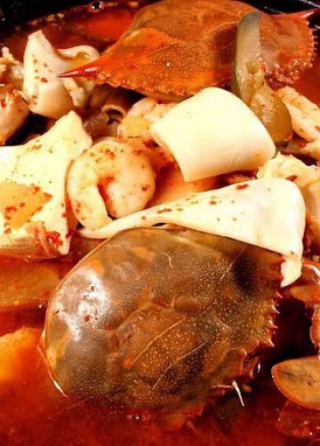 鮮蟹(斬件),虾仁,鱿鱼(切片),虾米(洗净),豆腐(切塊),罗白(切片),草菇,黄瓜(切片),韓国泡菜,盐,味精,白糖,韓国辣酱,辣椒粉,高汤,洋葱片