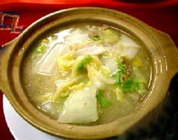 3、将牛百叶、白菜、生姜放入沙锅中,加适量清水,旺火烧沸后改文火煲2小时,加精盐、味精调味后即可食用。