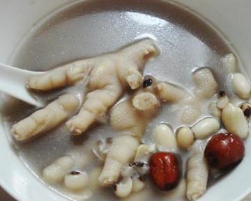 眉豆30克,花生30克,鸡脚6只,瘦肉100克,红枣5粒,陈皮0.25块,姜1片,盐适量