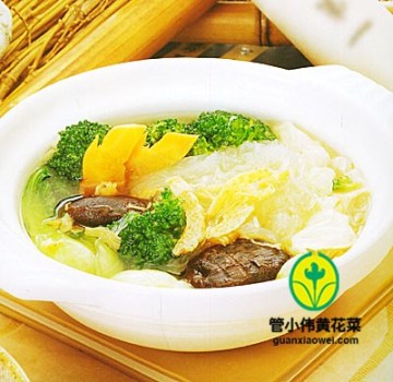 主料: 菜花150克、西兰花150克、黄花菜干25克、海瓜子200克、高汤200毫升、