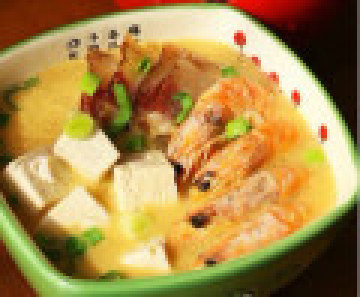 1、虾挑去虾线、豆腐切小块、鸭蛋用叉子按碎。2、油烧热,下姜丝、花椒、八角烹香。3、下入虾炒变色,拢在一边。4、放腊肉煎出油。5、倒1大碗清水,大火煮开,用漏勺撇去浮沫和大料。6、加咸鸭蛋。7、加豆腐大火烧开,转小火慢炖20分钟。蒜苗切丁,撒入汤中关火。