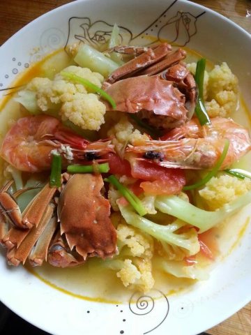 蟹,基围虾,有机花菜,西红柿,葱段,蒜,姜,白葡萄酒,盐,白胡椒粉