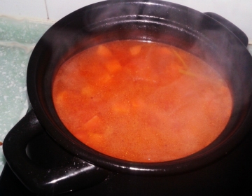 13.汤沸腾之即。把切好的西红柿倒入,接着熬到汤变红,再下土豆。土豆熟后这道汤就成功了!(我先放了一个西红柿,结果全化汤里了,后来临起锅又放了一个)