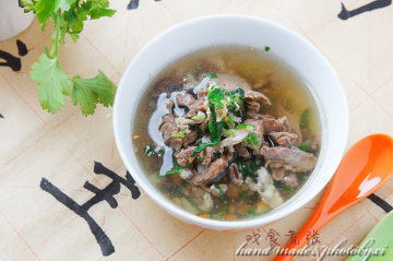 汤中要多放醋和胡椒粉,味道才会香浓开胃。羊血很容易熟千万不要煮过火,而失去脆嫩的感觉。