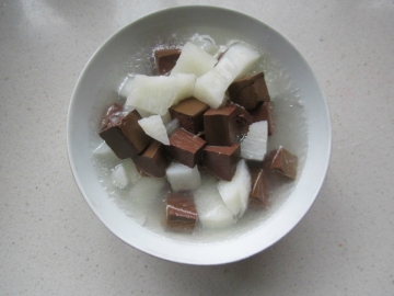4.锅内烧开鸭骨汤,放入鸭血煮至沸腾时,连汤一起放入碗内。