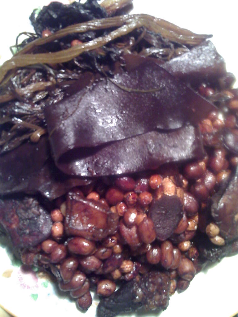 及以下步骤:原料 成品 原料 成品 原料 成品 将黄豆和花生米放锅的最底层 中间放调料类 上面放青菜类 放入酱油 和适量清水 中火炖30分钟以上 待黄豆熟了(但不要炖烂了)把汤汁烧干即可 原料 成品