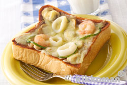 洋葱(1/3个) / 青椒(半个) / 口蘑(3个) / 土司(2片) / 虾(4只) / 鱿鱼圈(6个)