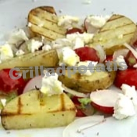 3、切水萝卜和洋葱,放在盘子里, 添加马铃薯和费塔奶酪。 加少许橄榄油,盐,胡椒后可食用。适合鱼类和肉类佐餐。比如说烤猪肉里脊。