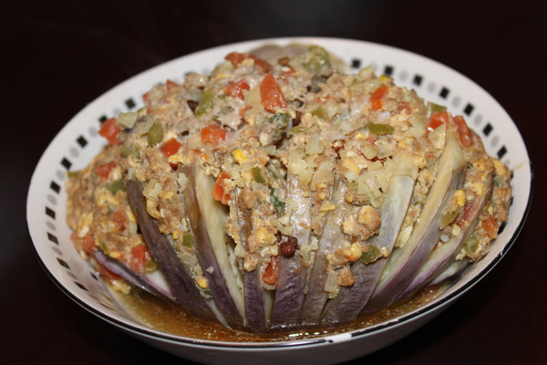 及以下步骤:都夹好后放到盘子里 放入蒸锅 水开后大火蒸15~20分钟就好了 。出锅前可在上面撒些蒜末提味。 将茄子洗净 去除根茎 竖切片 注意千万不要切断 要在根部留一点量 一次切成折页型 备用 肉馅放少许美极鲜酱油 少去生抽 花椒粉 食用油一勺 香油一勺 盐(可多放些 要稍咸些 因为茄子不放盐 所以馅料要稍咸些 蒸时茄子才可以入味) 鸡精 将茄子洗净 去除根茎 竖切片 注意千万不要切断 要在根部留一点量 一次切成折页型 备用 肉馅放少许美极鲜酱油 少去生抽 花椒粉 食用油一勺 香油一勺 盐(可多放些 要稍咸些 因为茄子不放盐 所以馅料要稍咸些 蒸时茄子才可以入味) 鸡精 把鸡蛋炒成碎末状备用 把西红柿和青椒切小丁备用 把材料 3和4 放到肉馅里拌匀备用(注意一定要常尝咸淡 要比平常拌的馅咸一点才好哦) 把拌好的馅 一点点的夹入每片茄子中 劲量底部也要夹到馅 有助于茄子入味 都夹好后放到盘子里 放入蒸锅 水开后大火蒸15~20分钟就好了 。出锅前可在上面撒些蒜末提味。