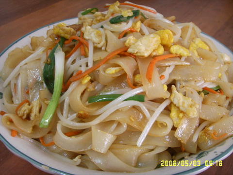 3、锅烧热后,放油,一定要多,先用中火把胡萝卜丝放进锅里炒,加点盐,变软后,接着把河粉放进锅里,把火转大,把河粉划散(最好用筷子代替铲,这样不容易断).然后把灼过的豆芽和葱段放进去一起炒.一边用筷子拔散河粉,一边把(3)的酱汁慢慢倒进去.河粉均匀着色