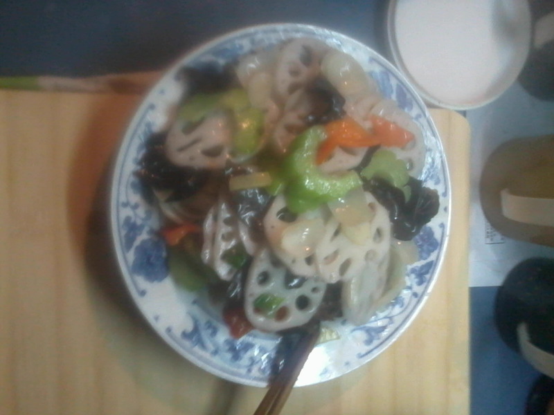 1、将白藕去皮切成薄片,浸泡在清水里;红椒、苦瓜、木耳切小片、百合掰成片。