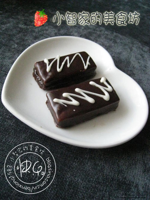 及以下步骤:比量着切成均匀大小的长条状。 长条状摆入烤盘。 烤箱预热175度上下火烤18分钟出锅备用。 巧克力加牛奶加黄油隔水加热成巧克力淋酱。 片饼干字间夹巧克力酱。 。。。。。 片饼干字间夹巧克力酱后放入制成的巧克力淋酱中。 用筷子夹起放在油纸上至放凉凝固。 最后:挤上白巧克力酱做装饰(夹心部分要用巧克力酱才能粘得牢固些,不建议用步骤6中巧克力淋酱,自己制作仅融华巧克力即可,不用加黄油和牛奶) 最后:挤上白巧克力酱做装饰(夹心部分要用巧克力酱才能粘得牢固些,不建议用步骤6中巧克力淋酱,自己制作仅融华巧克力即可,不用加黄油和牛奶)