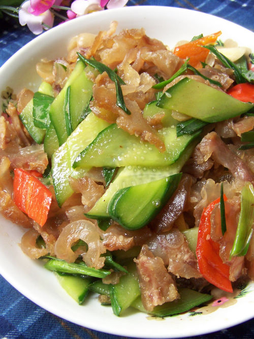 5、5,待黄瓜片变软,倒入切好的牛蹄筋片,翻炒均匀。