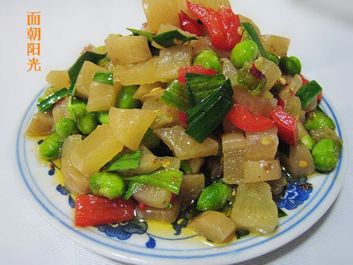 因为萝卜条是咸的,即使加了青豆仍偏咸,所以此菜不需放盐