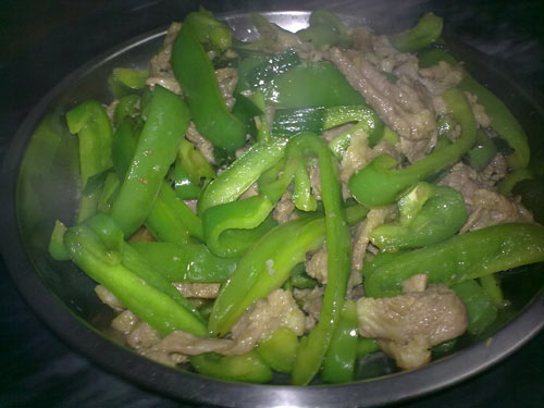及以下步骤:放入葱煸炒。 倒入青椒翻炒均匀即可。 材料:青椒4个、瘦肉250克。 切成片状的瘦肉内加入蒜、盐、酱油。 均匀搅拌,腌制20分钟。 锅中放油,切成条形的青椒倒入锅中翻炒。 下盐,翻炒几下,即装盘放置。 锅中放油,腌制好的瘦肉倒入锅中炒散。 放入葱煸炒。 倒入青椒翻炒均匀即可。