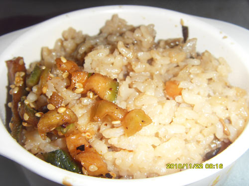 茄子(适量) / 胡萝卜(适量) / 土豆(适量) / 大米(适量) / 肉丁(适量)