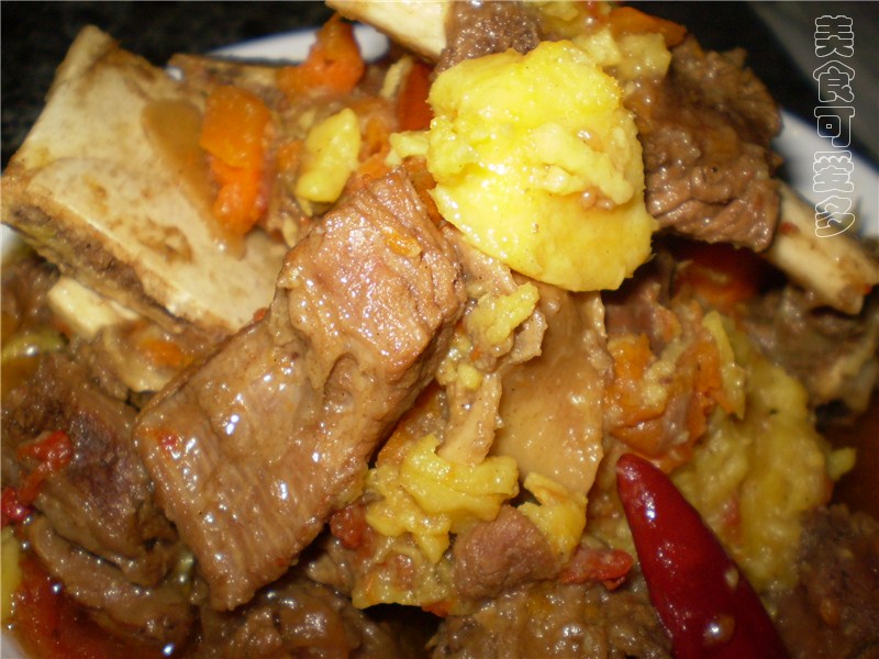 6、半个小时后,香气逼人的牛排骨就做好了,再放入红薯块、胡萝卜块炖到其口感刚好,搅拌均匀,就可以出锅装盘了。