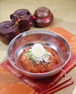 韩式拌冷面 韩式拌冷面是在冷面面条里放入辣且浓稠的拌酱后搅拌吃的美食。韩式拌冷面也可以放入生鱼片,这是叫做'咸兴冷面'的咸镜道的特有乡土食品。冷面要在温度为零下的严冬吃,才能感觉到其真正的味道,这就叫做'以冷治冷'。