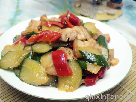 及以下步骤:将五花肉焯熟切片。 黄瓜亦去囊切片待用。 将五花肉焯熟切片。 黄瓜亦去囊切片待用。 将五花肉焯熟切片。 黄瓜亦去囊切片待用。 起油锅,下姜、蒜爆香、将肉片炒香。 下黄瓜一起翻炒。 待黄瓜断青后,下盐、鸡精调味,下一些红椒丝使其颜色好看些,也增加些香味。 然后就可以上菜了。