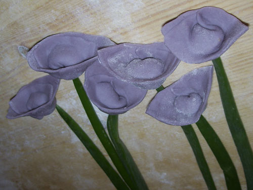 4、把紫色面团擀成薄片、切成梯形和三角形面片、放入一点肉馅包上边。