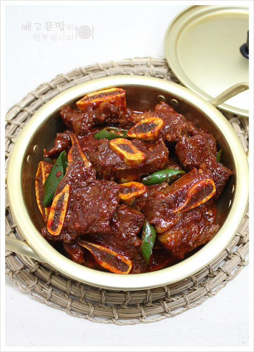 及以下步骤:块大的改一下刀。 为了牛骨和肉容易分离,在肉和骨之间来一刀。 煮肉的汤要留下,并纱布淋净。 准备调料:酱油 10勺,料酒3勺,辣椒酱 2勺,辣椒粉 3勺,蒜泥 3勺,白糖 2勺,香油 1/2勺,并搅拌均匀。 锅内依次放入牛排,调料、3杯肉汤开始炖煮。 中火炖煮,为防止调料糊锅,要时不时翻动一下。 汤耗过半时,加入斜切的大葱1根、青辣椒3个,然后继续炖煮,直到汤耗干。 请坐,倒酒,干杯,干否。 汤耗过半时,加入斜切的大葱1根、青辣椒3个,然后继续炖煮,直到汤耗干。 请坐,倒酒,干杯,干否。