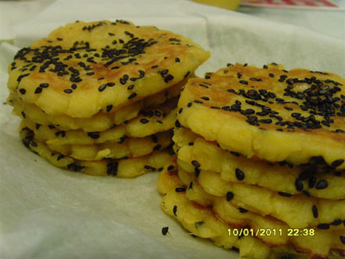 及以下步骤:再来一张特写,实在太香了,忍不住偷吃了一件!(*^__^*) 嘻嘻! 先将番薯蒸熟后去皮猜烂,加入白糖、炼奶、椰浆、生油搅拌均匀,再适量放入糯米粉猜成粉团。 粘米粉撒在桌面上,方便将粉团压开,另外煎的时候粘米粉可以让表面松脆。用自己喜欢的模具压出图案。 先将番薯蒸熟后去皮猜烂,加入白糖、炼奶、椰浆、生油搅拌均匀,再适量放入糯米粉猜成粉团。 粘米粉撒在桌面上,方便将粉团压开,另外煎的时候粘米粉可以让表面松脆。用自己喜欢的模具压出图案。 将做成型的饼放在炒熟的黑芝麻上轻按上。 用慢火煎,记得用慢火,因为有糖份,不然就会容易糊了! 两面都煎至金黄焦脆的样子就差不多了! 香脆的椰香番薯饼出炉了! 再来一张特写,实在太香了,忍不住偷吃了一件!(*^__^*) 嘻嘻!