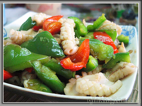 今天来个辣椒炒鱿鱼,国庆期间打风,估计没什么船出海,海鲜都少了。