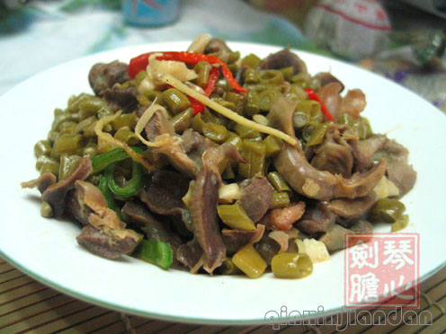 及以下步骤:酸豆角洗净,用温水浸泡片刻,切成粒。 将鸭肾汆熟切片,肥猪肉切片。 酸豆角洗净,用温水浸泡片刻,切成粒。 将鸭肾汆熟切片,肥猪肉切片。 酸豆角洗净,用温水浸泡片刻,切成粒。 将鸭肾汆熟切片,肥猪肉切片。 酸豆角洗净,用温水浸泡片刻,切成粒。 起油锅,将肥肉炸出油,爆香姜、蒜、辣椒丝,下肾片翻炒。 下酸豆角粒,辣椒油,继续炒熟。 用鸡精调下味道就可以上碟了,酸酸辣辣,开胃。