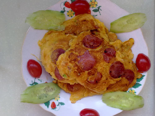 及以下步骤:在锅中放入少许油,一定使锅底沾满油,油不要放太多,因为每次煎两至三个后还要补点儿油,用勺子将面糊轻轻放入锅中,小火煎。 依据自己口味在还未煎的一面上放两片腊肠片,我觉得两至三片就可以了,放多了就咸了。 煎一会儿后马上翻过来煎,时间一定掌握好,可以小火反复煎两面。 煎好出锅,掌握时间的小窍门,一开始煎的一片可以尝一下以便控制火候和时间,对于我来讲第一个小饼总是试验品,呵呵。 将准备好的葱末、腊肠粒、胡萝卜泥儿放入面糊中搅拌均匀。 将剩下的腊肠切成小薄片。 在锅中放入少许油,一定使锅底沾满油,油不要放太多,因为每次煎两至三个后还要补点儿油,用勺子将面糊轻轻放入锅中,小火煎。 依据自己口味在还未煎的一面上放两片腊肠片,我觉得两至三片就可以了,放多了就咸了。 煎一会儿后马上翻过来煎,时间一定掌握好,可以小火反复煎两面。 煎好出锅,掌握时间的小窍门,一开始煎的一片可以尝一下以便控制火候和时间,对于我来讲第一个小饼总是试验品,呵呵。
