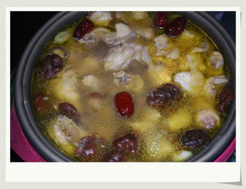 4、吃前汤内放枸杞,更营养也更好看。一定要鸡煮好了开吃前放哦,枸杞不好多煮的