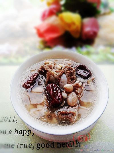 薏米有健脾益胃,补肺清热、祛风除湿,养颜 驻容、轻身延年、容颜不老。 1、减肥 2、降血、预防心血管疾病 3、促进新陈代谢 4、祛斑、美白肌肤 5、提高免疫力 6、防癌抗癌 7、滋润肌肤 花生的功效: 1、花生中的维生素k有止血作用。花生红衣的止血作用比花生更高出50倍,对多种出血性疾病都有良好的止血功效。 2、花生含有维生素e和一定量的锌,能增强记忆,抗老化,延缓脑功能衰退,滋润皮肤。3、 花生含有的维生素c有降低胆固醇的作用,有助于防治动脉硬化、高血压和冠心病。 4、花生中的微量元素 硒和另一种生物活性物质白藜芒醇可以防治肿瘤类疾病,同时也是降低血小板聚公证机关预防和治疗动脉粥样硬化、心脑血管疾病的化学预防剂。 5、 花生还有扶正补虚、悦脾和胃、润肺化痰、滋养调气、利水消肿、止血生乳、清咽止疟的作用。 禁忌:花生能增进血凝,促进血栓形成,故患血黏度高或有血栓的人不宜食用。 花生霉变后含有大量致癌物质——黄曲霉素,所以霉变的花生千万不要吃。 红枣就不用多说了,具有补血美颜等功效。 排骨提供人体生理活动必需的优质蛋白质、脂肪,尤其是丰富的钙质可维护骨骼健康。具有滋阴润燥、益精补血的功效。