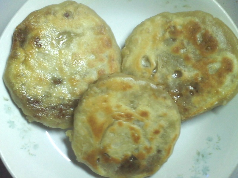 2、面同馅做成小薄饼,放在平底锅中干烙,锅中不用再刷油,因为烙饼的过程中饼会出油。