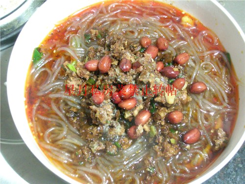 及以下步骤:起锅以前先关火.将小葱倒入锅中,用余温将小葱的香味挥发出来。 烧开水将白色的豆粉丝发涨。 面碗中放红油辣椒.花椒末.生抽.蒜泥,鸡油,麻油,味精用鲜汤调制。 用开水烫制青菜数片放于碗底。 再将泡制好的豆粉丝过一道沸水,直接放入碗内.上面放上制作好的肉末,有条件的话可以放几粒炸制酥脆的花生米,没有的话也可以不要。 起锅以前先关火.将小葱倒入锅中,用余温将小葱的香味挥发出来。 烧开水将白色的豆粉丝发涨。 面碗中放红油辣椒.花椒末.生抽.蒜泥,鸡油,麻油,味精用鲜汤调制。 用开水烫制青菜数片放于碗底。 再将泡制好的豆粉丝过一道沸水,直接放入碗内.上面放上制作好的肉末,有条件的话可以放几粒炸制酥脆的花生米,没有的话也可以不要。